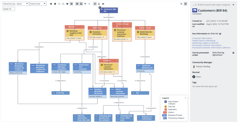 Very similar to other “right to be forgotten” regulations introduced by GDPR and CCPA/CPRA, by September 2023, organizations must accommodate customers’ requests when they would like their personal information to cease being used in the manner first approved. As mentioned above, while Collibra doesn’t interact with record level data and will therefore not action these requests, by connecting your technical metadata to your logical and conceptual models – you are able to very efficiently identify the systems where applicable data exists, and more importantly understand the business processes that produce or interact with that data set.