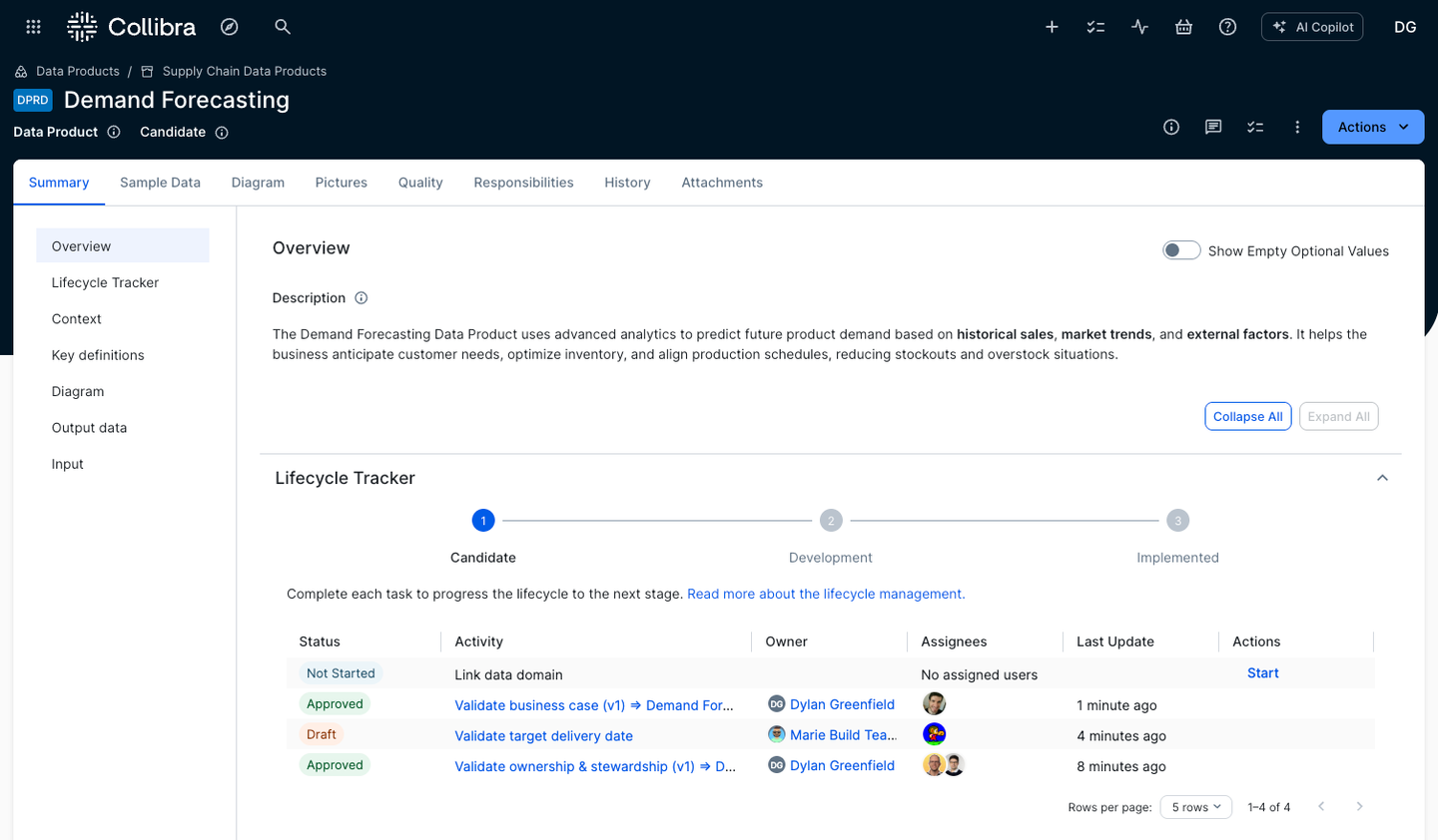 - A lifecycle progress tracker for data products accelerates the management and publishing of data products, providing clear visibility into each stage, with adaptable phases designed to align with your organization’s requirements.
