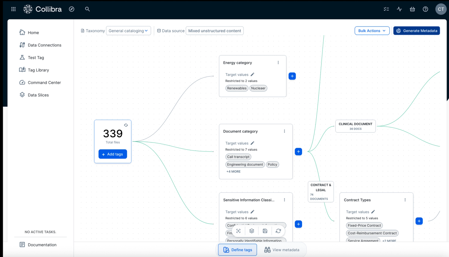 Collibra Unstructured AI makes unstructured content AI-ready by transforming contracts, presentations, transcripts and emails into governed knowledge assets. It uses automated enrichment, semantic tagging and high-accuracy search to convert raw, disconnected files into structured, AI-ready inputs for GenAI and agentic workflows.