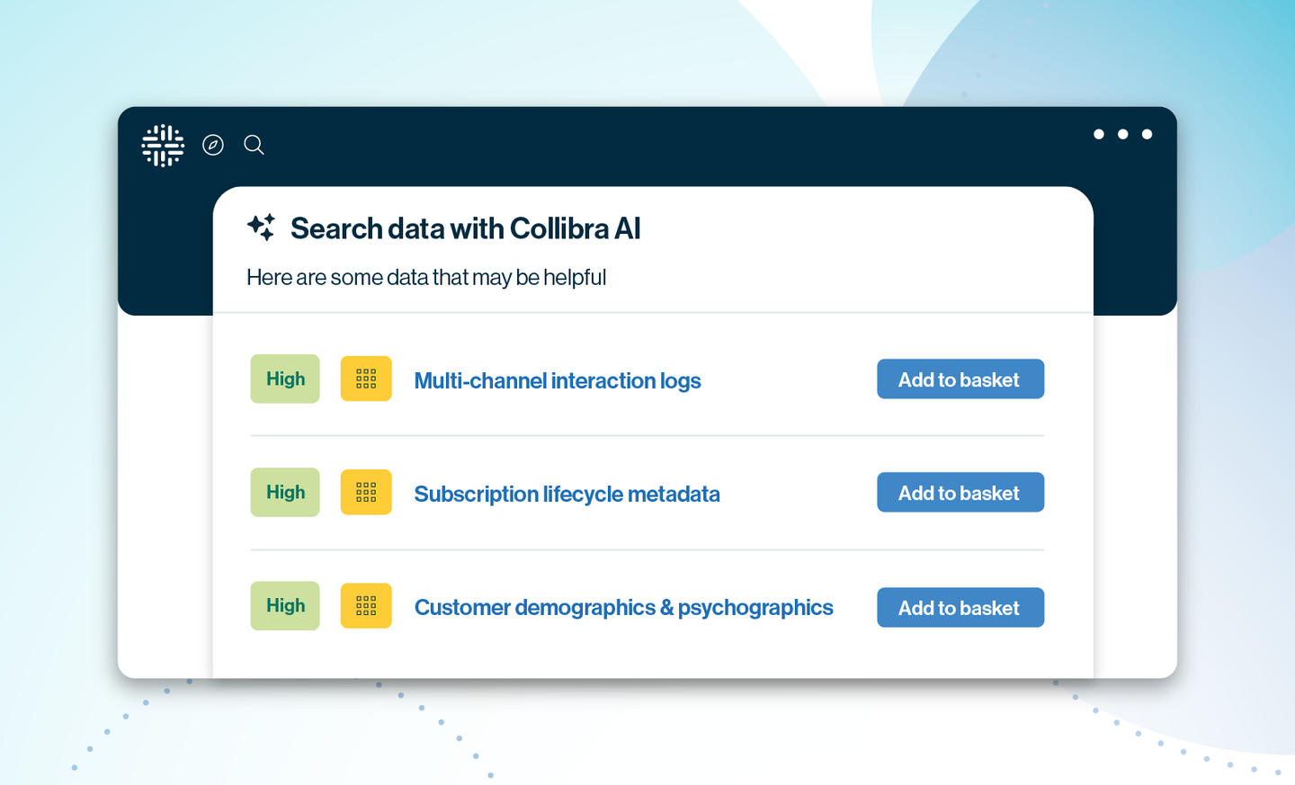 Collibra data recommender puts an end to manual, time-consuming data hunting. Instead of passively browsing catalogs or stitching together datasets, data scientists and engineers receive proactive, AI-driven recommendations of the most relevant, governed data products for their use case.