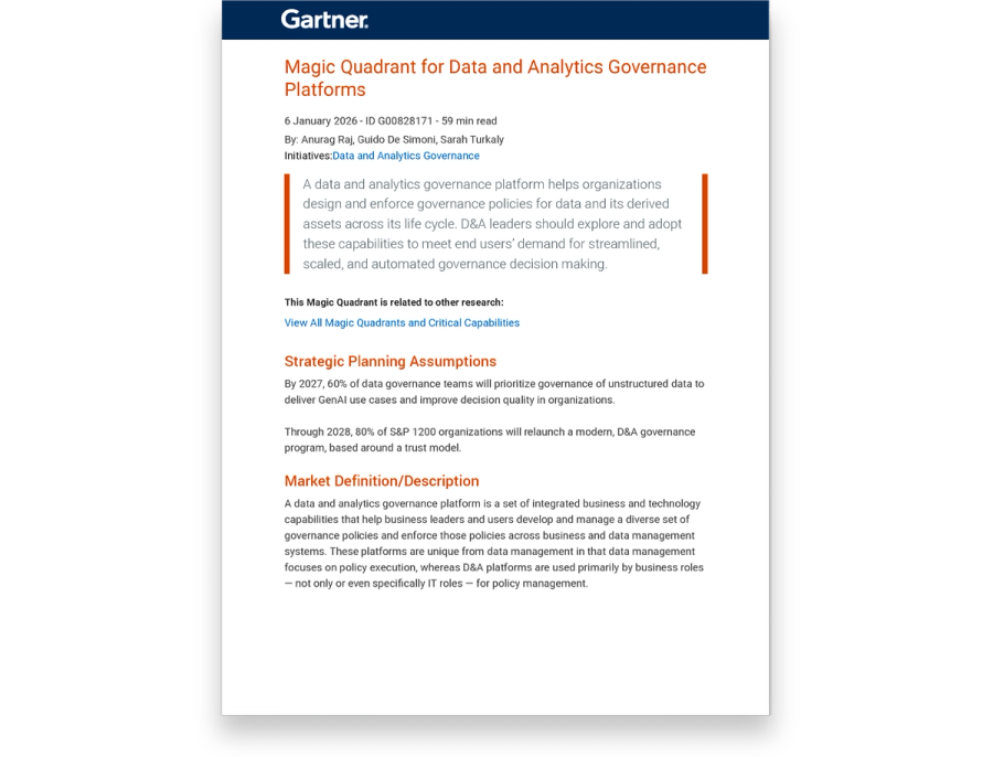 Gartner, Gartner, Magic Quadrant™ for Data and Analytics Governance Platforms, Anurag Raj, Guido De Simoni, Donna Medeiros, January 2026 - ID G00828171